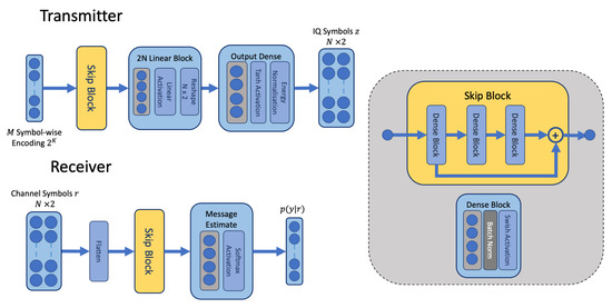 The architecture of the transmitter and receiver networks containing the dense residual skip block for feature extraction.