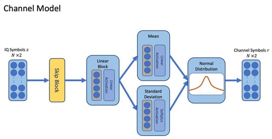 To train the transmitter and receiver, we apply a channel MDN model. The channel MDN model is trained in a supervised manner against observations of noise transmitted through the true channel. Unlike the GAN, it does not require a separate discriminator model and does not require multiple denoising steps in comparison to the diffusion modelling approach. The resulting channel model is combined with the transmitter and receiver during an end-to-end learning phase, where it emulates the true channel environment. The MDN model estimates parameters for the mean and standard deviation and mixing coefficients for Gaussian distributions for each individual symbol in L time-steps [18]. The resulting mixture of Gaussian distributions is combined to generate a probability density over the channel outputs (Equation (3)). In our implementation, each symbol may have a different mean and standard deviation, which are produced by the main path of the network consisting of a skip block and dense linear block illustrated in Figure 4.