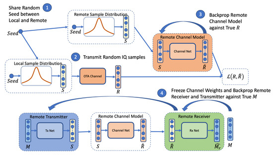 An overview of the training procedure is illustrated in Figure 5, where in stage 1, the initialisation of the training procedure requires that both an origin transmitter and remote receiver share the same random seed. This is used to draw continuous IQ samples of desired block length K from the uniform distribution . We emphasise that the random sequence S is not an information-carrying modulation. In stage 2, the random sequence is transmitted from the origin transmitter to the remote receiver, producing channel symbols R. A batch size of 128 blocks is collected prior to training the channel model. Backpropagation is applied in stage 3 to train the remote channel model against the true channel symbols R using the NLL loss. Stage 4 performs end-to-end training of the transmitter and receiver on the receiver side using the trained channel model, without the need for a feedback channel.