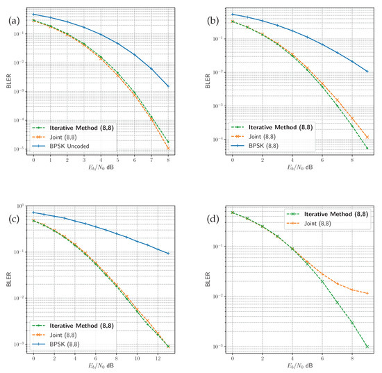 Comparison of BLER performance in the four channel environments. Uncoded bit BPSK modulation is compared with the joint and the proposed iterative method in the (a) AWGN channel, (b) Rician fading channel, (c) Rayleigh fading channel, and joint and iterative methods are compared in (d) the PA-AWGN channel.