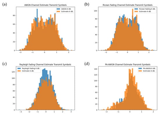 Histogram of channel symbols for each instantaneous channel function and the trained channel model at training SNR of 6 dB for bit messages transferred through the transmitter model. Comparisons are shown for the (a) AWGN channel, (b) Rician fading channel, (c) Rayleigh fading channel, and (d) PA-AWGN channel.