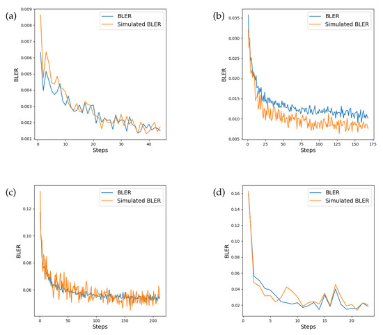Comparison between BLER performance on the instantaneous channel transfer function and the simulated channel model recorded after each epoch of training. There is a high correlation between BLER between the true transfer function and the simulated channel model. The monitored BLER is shown in the (a) AWGN channel, (b) Rician fading channel, (c) Rayleigh fading channel, and (d) PA-AWGN channel.