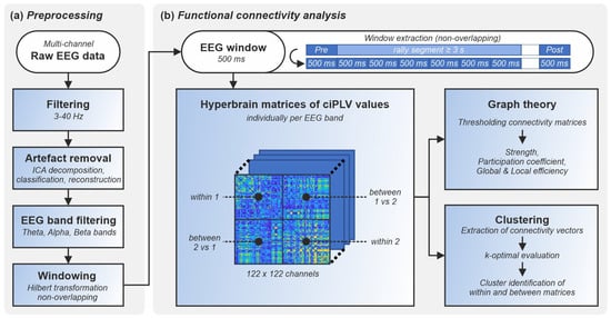 Visual representation of the proposed EEG analysis pipeline including two phases of (a) preprocessing and (b) functional connectivity analysis via calculation of hyperbrain matrices of the ciPLV values individually per band and window with subsequent graph theory and clustering analysis. The extraction of the analysis windows of 500 ms length each out of the overall rally segment ≥ 3 s length is shown on the upper right side.