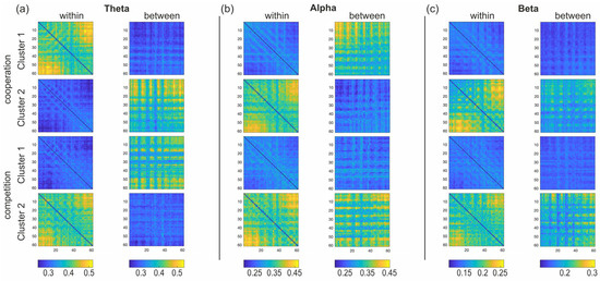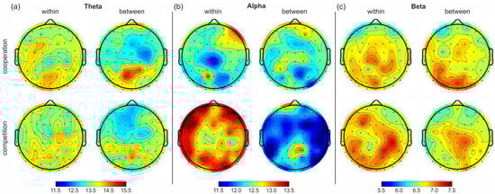 In the beta band (Figure 5c), although all strength values were much lower than those in the other two frequency bands, we observed that in the within-brain maps, the nodes with higher numbers of connections were in the central and occipital areas for cooperation and in the temporal, parietal, and occipital areas for competition. In the between-brain map, during cooperation, we observed an increase of nodes with high numbers of connections in the occipital area with respect to the within-brain map, whereas the between-brain map during competition showed a reduction in strength with respect to both cooperation and the within-brain map for competition, with only some nodes in the central–parietal area having higher strength values.