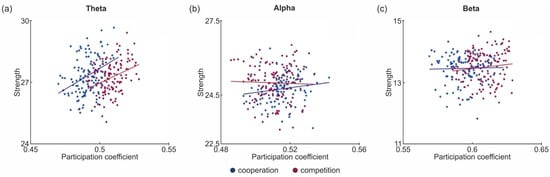 Scatterplots of Pearson’s correlation results of the associations between average participation coefficient and average strength of hyperbrain matrices, respectively, for each frequency band: (a) results for the theta band in cooperation vs. competition condition; (b) results for the alpha band in cooperation vs. competition condition; (c) results for the beta band in cooperation vs. competition condition. Lines indicate the direction of relationship between average participation coefficient and average strength in hyperbrain matrices.