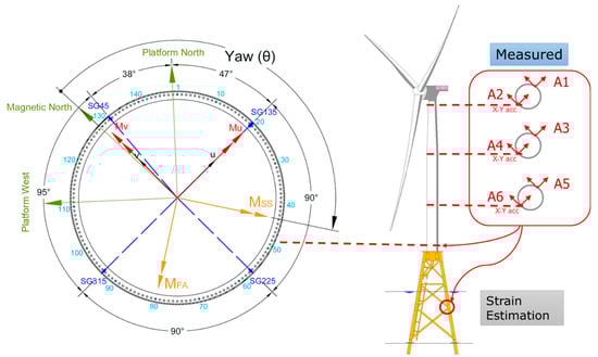 The limitations associated with actual data collection have inspired two critical studies for SHM of OWT structures: sensor placement and modal expansion. Optimal sensor placement has a long history going back to SHM for structures subjected to earthquake or wind loads [34]. These methods have been applied in the context of OWTs and show that the optimal placement of sensors is affected by both the support structure’s unique characteristics and the SHM campaign’s goal: parameter estimation or strain estimation [35]. Even with an optimal placement of sensors, an asset manager may want to estimate the fatigue damage at a non-instrumented location. In this case, virtual sensing methods can be used to estimate the strain at such locations. Virtual sensing is the process of estimating the response of a system at locations that are difficult to measure through methods that use a combination of models and existing physical sensor data.