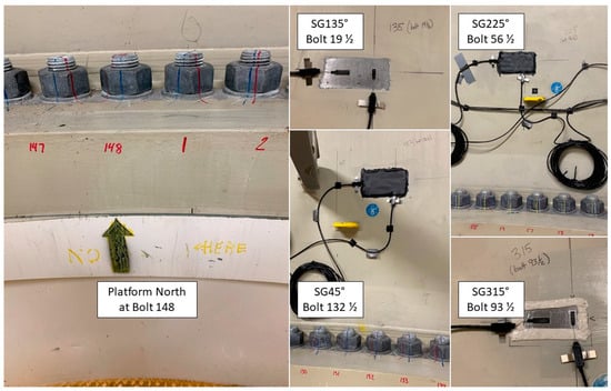 Due to the slight offset of SG45 from magnetic north, principal axes are defined as Mu along SG135 and SG315, as shown in Figure 1. Positive Mv is then defined as 90 degrees counterclockwise from positive Mu, which situates Mv between magnetic north and SG45. The light blue numbers, beginning with the number 1 positioned slightly clockwise from platform north, represent bolt numbers. During installation, the locations of SGs were noted according to bolt number, as shown in Figure 2.