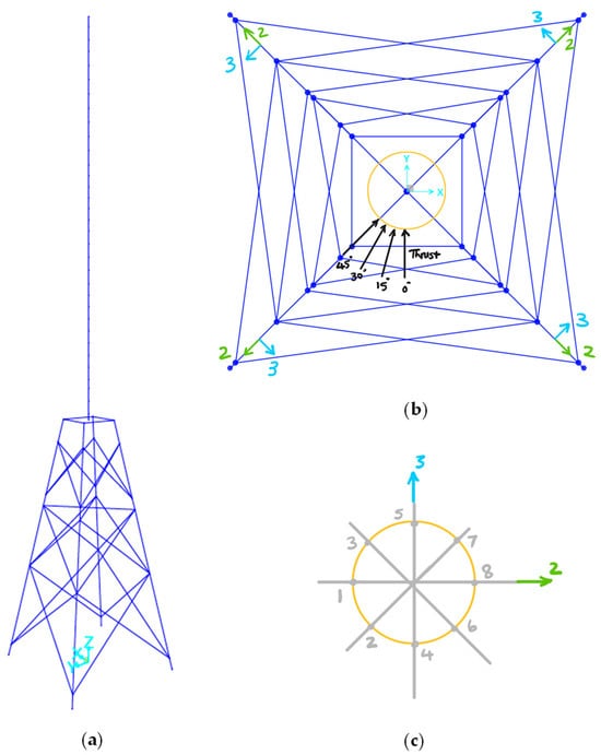 (a) 3D view and (b) top view of the BIWF-B2 turbine in SAP2000 tool (not to scale), and (c) one beam element section with 8 stations (#1 to #8). The local axes 2 and 3 of the jacket leg section in (c) are also shown in the global coordinates in (b).