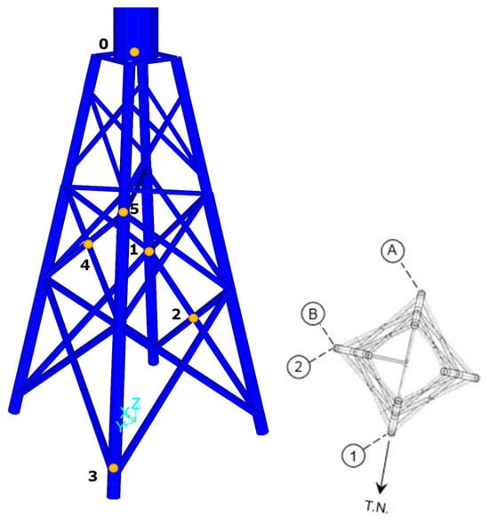 Hotspots on the jacket of the BIWF to predict strain. Node 0 is the measured strain at the tower base. Nodes 1 and 3 are the jacket leg nodes, and nodes 2 and 4 are the brace nodes in seawater with cathodic protection. Node 5 is the jacket leg node in the splash zone. Axis 1, 2, A, and B are the horizontal axis of the jacket leg at the mudline that were used in jacket drawing.