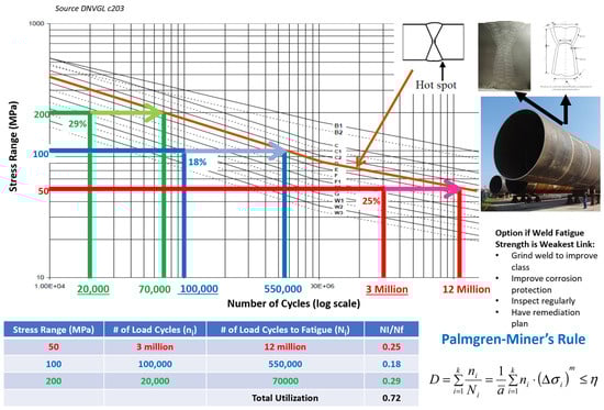 Fatigue damage and remaining life are typically assessed according to S-N curves developed based on laboratory testing of small-scale steel specimens. “S” stands for stress, and “N” stands for the number of cycles to failure. Acknowledging the existence of multiple S-N curves and fatigue design documents that are potentially relevant to this work, DNVGL-RP-C203 was selected as the S-N framework of choice [47]. Most existing research on offshore wind turbines has utilized the DNVGL family of recommended practice documents. Figure 5 presents a simplified example of fatigue analysis using “in air” S-N curves for different weld classes. For each stress-cycle bin, the total number of observed cycles is found via a rainflow cycle count, and then, a ratio is formulated with the number of observed cycles and the number of cycles allowed at that point in the S-N curve. These ratios are then added for each stress-cycle bin to find the total accumulated fatigue damage. The accumulated damage of one refers to the allowable fatigue capacity assuming a design fatigue factor (DFF) equal to one.