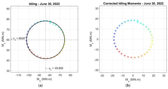 In an experiment on 30 June 2022, the BIWF-B2 turbine was manually rotated from 0 to 360° to capture the self-weight moments to correct the SGs. The turbine was initially set to be located at the north offset, i.e., yaw = 130°. Then, it was rotated manually in 10° increments using SCADA. The blades were fully feathered to keep the rotor from spinning and minimize any operational conditions on the experiment results. Note that the yaw angle starts from magnetic north, as shown in Figure 1, and rotates clockwise. The moments calculated from the raw SG measurements, as shown in Figure 6a, are on a circle as expected; however, the circle’s center is not at (0,0). So, the strain gauges are corrected so that the moments’ center is moved to the origin, as shown in Figure 6b. The raw strain-gauge measurements are corrected using (10), (11), (12), (13), and the circle center (uc and vc) values. The circle also does not match itself around coordinates (3,18). The slight mismatch is because the moment values in the plots are the average moments over 5 min of data with a standard deviation.