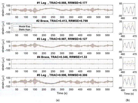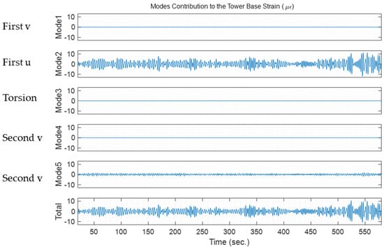The quasi-static strain is the quasi-static part of the strains and is estimated as a ratio of the first strain mode shape at the location of interest to that of a reference strain measurement. For this part, the strain measurements are low-pass filtered (below 0.11 Hz) to represent only the quasi-static part of the response. The quasi-static strain response is calculated as (19).