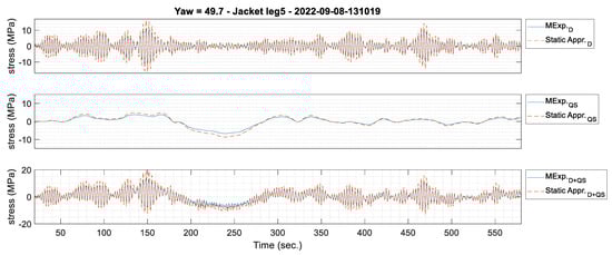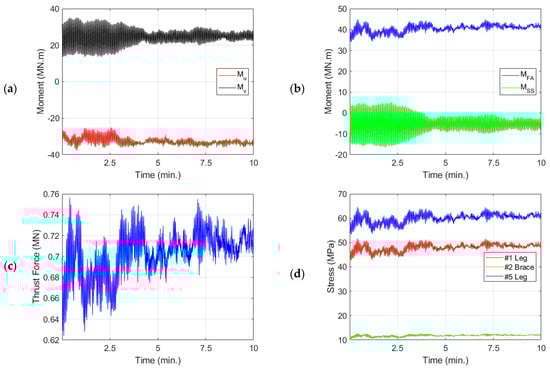 For this paper, a 1 MN load is applied at the RNA level at four different angles, 0°, 15°, 30°, and 45°, as shown in Figure 3, to estimate the stresses in the jacket members. The largest axial stress, S11 in the main axis of each element, is obtained in eight stations around the perimeter of the section, as shown in Figure 3c. The stress hotspot for fatigue analysis should be chosen at welds between the braces and the tubular joint. Station 3 is chosen for the leg joints and the maximum stress between eight stations for the braces. The result for each angle is shown in Table 2. The maximum S11 between all the angles is chosen as the stress for the leg–brace joints, as shown in Table 3. The stresses are then used to estimate the stress linearly by scaling the thrust force from 1 MN to any other thrust force over time.