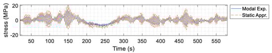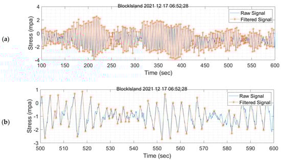Hysteresis filtering was used based on recommendations from the online resources related to fatigue analysis found in both the Siemens and MATLAB documentations [46]. Hysteresis filtering works by removing reversals below a minimum threshold from the time series. For this analysis, the minimum threshold is set at 0.5 MPa. After utilizing hysteresis filtering to remove these very small cycles, peak–valley filtering is used to identify the local minima and maxima in the time series. Hysteresis filtering and peak–valley filtering are found in the ‘findTurningPts’ function from the MATLAB resource on fatigue analysis. Hysteresis and peak–valley filtering reduce the low-stress cycles to 0.5 MPa, and the peaks and valleys of the stress time history become clearer. However, hysteresis filtering is insufficient, as it does not have a frequency component to reduce noise, and the low-stress cycles (e.g., 1 MPa) remain. So, an FIR filter added to the raw measurement is needed to remove low-frequency noises. In this study, FIR, hysteresis, and peak–valley filters are used to assess the fatigue damage.