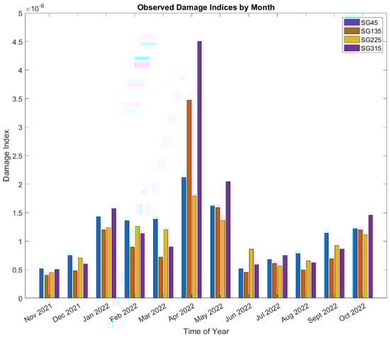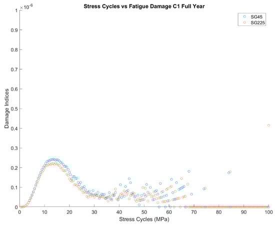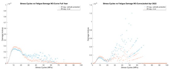 Based on the analysis of the months and the stress cycles, there appear to be at least two categories of operation, namely (1) stationary signals and (2) non-stationary signals caused by startup/shutdown. The stationary signals are observed to contribute to less damage than the startup/shutdown events. Moreover, some stress cycles provide higher damage, as shown in Figure 22. Comparing the plots in Figure 22 shows that there are discrete events happening in April 2022, when looking at the relative damage from high-stress cycles between 20 and 70 MPa.