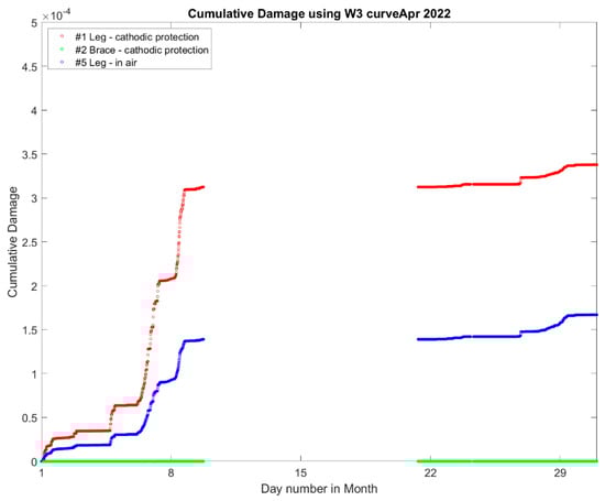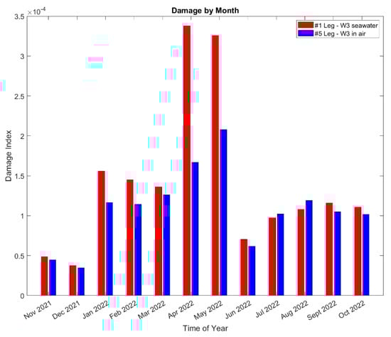 Although many factors affect the damage index (e.g., wind speed and rotor speed), the change in the pitch angle appears to play an important role. The damage index and the change in pitch-angle peaks occur at approximately the same time. The cumulative damage at legs #1 and #5 vs. the pitch angle during the 1-year monitoring is shown in Figure 29. There are some jumps in the cumulative plot, e.g., in May and early June 2022 that are related to the change in the pitch angle of the blades.