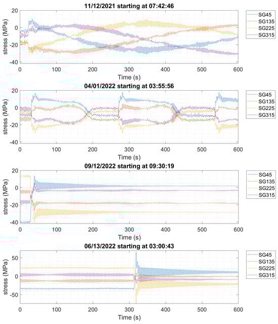 Stress time histories during 10-min data windows impose relatively high damage to the OWT on 12 November 2021 starting at 7:42 a.m., 1 April 2022 starting at 3:55 a.m., 12 September 2022 starting at 9:30 a.m., and 13 June 2022 starting at 3:00 a.m.