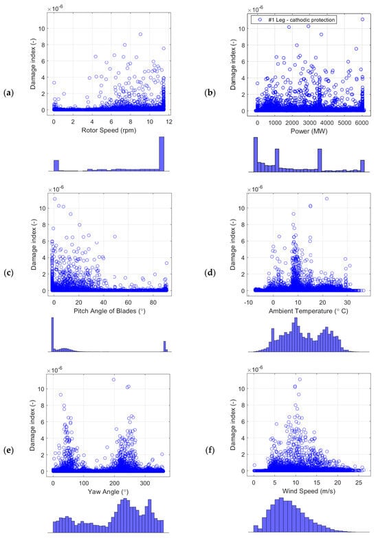 In this section, the effects of the environmental/operational conditions, such as wind speed, rotor speed, power, ambient temperature, yaw angle, and pitch angle of the blades, on the damage index and cumulative damage of the jacket at joint #5 are investigated.