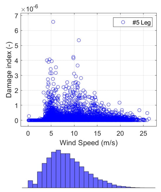 Figure 24f and Figure 25 show that the wind speeds correlated with the high damage indices in leg #1 and leg #5 are (1) wind speeds around 5 m/s when the turbine starts to operate (start-up condition) and (2) wind speeds around 10–11 m/s when the turbine produces the maximum power and the maximum thrust load. As shown in Figure 26, the high winds came mostly from SW and NW throughout the 1-year monitoring period, which is consistent with the damages that mostly occurred at yaw angles of approximately 230° and 320°, as shown in Figure 24e.