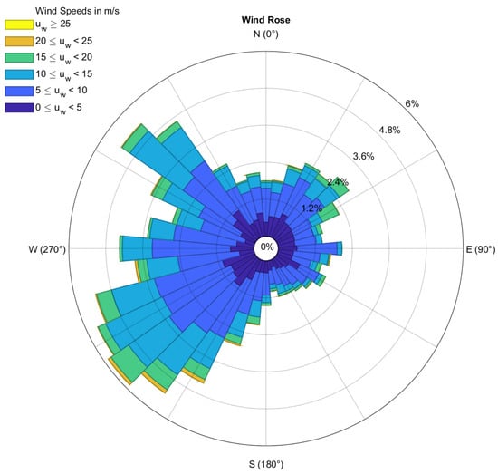 Wind rose for the block island turbine from 1 November 2021 to 1 October 2022. (The MATLAB function for plotting a wind rose can be found in [52]).