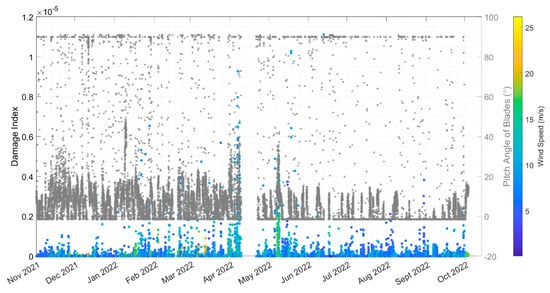 Damage index for the jacket joint #1 vs. pitch angle of the blades during 1 year of monitoring from November 2021 to October 2022.