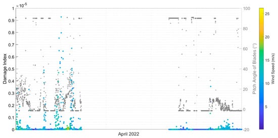 Another critical variable that impacts the damage index is the pitch angle of the blades. As shown in Figure 24c, the high damage values are also associated with the change in the pitch angle of the blades from 0 to 40° while the turbine operates. One theory for why high damage indices are associated with a shift in blade pitch is that, when the blades suddenly feather and reduce the thrust load, the tower moves in the fore–aft direction because of the eccentric position of the nacelle mass. Damage and change in the pitch angle for 1 year of monitoring data are shown in Figure 27. The zoomed-in plot for April is shown in Figure 28. The tower and nacelle oscillate freely without any thrust load from the feathered blades. Table 9 shows a 10-min dataset from 13 June 2022; while the turbine was operating at its rated rotor speed and generating full capacity, the blades were pitched and fully feathered. This could be considered an emergency shutdown or a maintenance shutdown, creating relatively high damage throughout the year. As shown in Figure 23, a half-stress cycle of about 95 MPa happened in an event on 13 June 2022. We suggest that, for maintenance purposes, operators do not shut down the turbine while it is operating at full capacity at a rated wind speed. The half-stress cycles throughout such events can create relatively large damage to the OWT foundation, whereas natural events (e.g., high winds) do not appear to damage the turbine support structure as much.