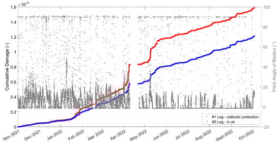 Cumulative damage of the jacket joint #5 vs. the pitch angle of blades during 1 year of monitoring from 1 November 2021 to 1 October 2022.