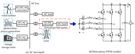 Figure 1a. Since the energy storage unit can stabilize the AC bus, the AC bus is considered an ideal AC source in this paper. The circuit of a three-phase PWM rectifier is shown in