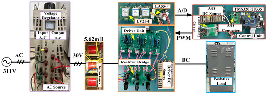 Figure 4, an autotransformer is connected to a 311 V grid to generate 38 V. The voltage and current sensors are LV-25P and LA-55P (LEM Company, Geneva, Switzerland), respectively. The power switching device is IRFP460 (INFINEON Company, Neubiberg, Gemany), and the control algorithm is implemented via TMS320F28335 (TI Company, Dallas, TX, USA). The experimental data are acquired using TPS2024B (Tektronix Inc., Beaverton, OR, USA), TDS1012B-SC (Tektronix Inc.), and DS1204B (RIGOL Company, Suzhou, China). The estimated inductance disturbances and the DC load are obtained from a four-channel DAC7724 (TI Company). A six-channel AD7656 (Analog Devices Company, Wilmington, MA, USA) is selected to collect voltage and current signals. To verify the superiority of the DDAC, experimental and simulation comparisons are conducted with the DDFLC and the DDPIC. The main circuit parameters are listed in