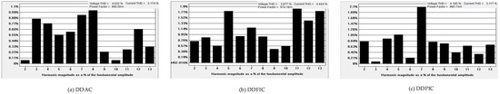 Figure 8, the 5th and 7th harmonics under DDAC are smaller than those of DDFLC and DDPIC. Moreover, the 9th, 11th, and 13th harmonics are reduced compared to the DDFLC and the DDPIC. These findings suggest that the DDAC has the best steady-state performance. Additionally, from