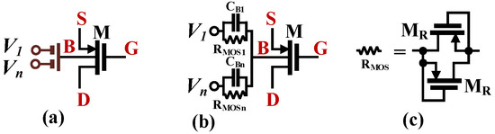 The transistor-level schematic of the OTA proposed in this work with n = 3 is shown in Figure 2. The circuit consists of an OTA with folded-cascode topology with a linearized input stage consisting of the transistors M1–M2 and M1SD, M2SD, and biased by the current sinks M3 and M4. The transistors M13–M18 were used for biasing. The multiple inputs were realized in a simple way by adding a capacitive voltage divider to the transistors M1 and M2, thus creating a multiple-input device, as shown in Figure 3. The input capacitors CBi were bypassed by large RMOSi resistances, which were realized as an anti-parallel connection of MOS transistors operating in a cutoff region. The large resistances provided the DC biasing of the M1 and M2 gates.