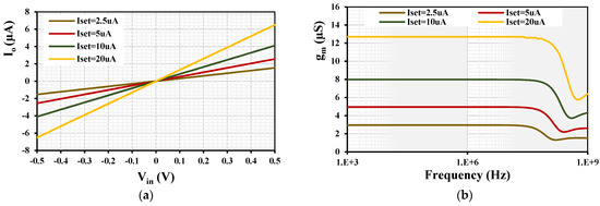 To obtain the dynamic characteristic of the MI-OTA, a sine wave of 1 kHz was applied to the input of the OTA. The extended linearity of the MI-OTA with various setting currents Iset = (2.5, 5, 10, 20) μA is shown in Figure 7a. The transconductance AC characteristic of the MI-OTA with various setting currents Iset = (2.5, 5, 10, 20) μA is shown in Figure 7b. The transconductance was (2.9, 4.9, 7.9, 12.6) μS, respectively. The transconductance AC characteristic with Iset = 5 μA was repeated for the Monte Carlo (MC) analysis with 200 runs and process, voltage, and temperature (PVT) corners, as shown in Figure 8.