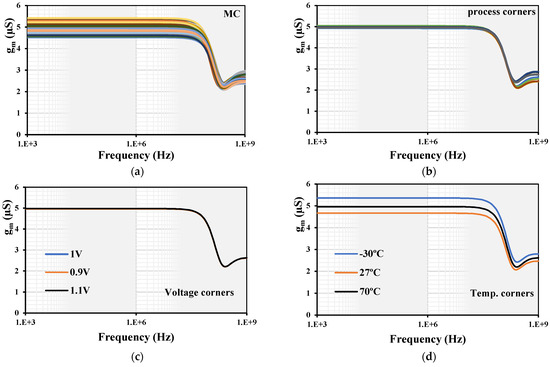The transconductance AC characteristic of the MI-OTA: (a) MC, (b) process, (c) voltage and (d) temperature corners.
