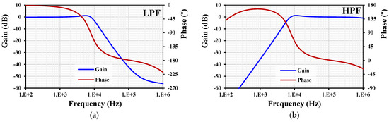 It should be noted that these universal filters are not designed for low-voltage low-power signal-processing applications. Nowadays, low-voltage low-power filters are required for biomedical applications, such as biosensors [3]. Universal filters using OTAs operating with a low supply voltage and with low power consumption are available in the literature [42,43,44,45,46,47]. However, these configurations cannot benefit from independent and electronic control of the quality factor and the natural frequency and cannot provide a high-quality (high-Q) filter. In modern applications, high-Q filters are strictly desirable for processing weak signals, such as the detection, measurement, and quantification of biomedical signals [48,49]. The bio-signal has the attributes of a low amplitude and a low frequency (≤10 kHz).