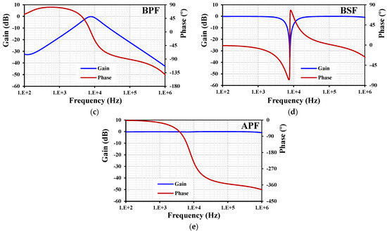 The variant filtering functions are shown in Table 1. It should be noted that the variant non-inverting and inverting transfer functions of the LPF, BPF, HPF, BSF, and APF can be obtained without inverted input signal requirements. For the BPF, if the input signals are Vin3 and Vin4, varying the quality factor will increase the gain of the transfer functions. Conversely, if the input signals are Vin5 or Vin6 and Vin7 or Vin8, varying the quality factor will not affect the gain of the transfer functions.