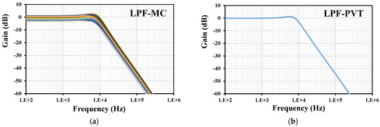 The frequency characteristics of the LP filter with (a) MC analysis and (b) PVT corners.