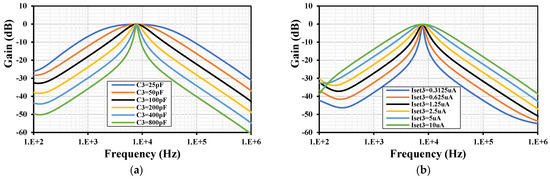 The frequency characteristic of the BPF with different values for (a) the capacitor C3 and (b) the setting current Iset3.