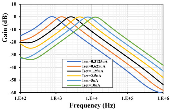 To demonstrate the tuning capability of the Q, Figure 11 shows the frequency characteristics of the BPF with: (a) Iset1–4 = 5 μA, C1,2 = 100 pF and tuning C3 = (25, 50, 100, 200, 400, 800) pF and (b) with Iset1,2,4 = 5 μA, C1–3 = 100 pF and tuning Iset3 = (0.3125, 0.625, 1.25, 2.5, 5, 10) μA. To demonstrate the tuning capability of the ω, Figure 12 shows the frequency characteristics of the BPF with C1–3 = 100 pF and tuning Iset = Iset1–4 = (0.3125, 0.625, 1.25, 2.5, 5, 10) μA. The natural frequency was (0.767, 1.44, 2.63, 4.62, 7.85, 12.7) kHz, respectively.