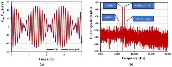 To determine the third intermodulation distortion (IMD3) of the BPF, two closed tones were applied to the input of the BPF. Both tones were a sine wave with an amplitude of 25 mV but with different frequencies: 7.5 kHz and 8.2 kHz. The transient analyses of the input and output signal are shown in Figure 13a and the spectrum of the output signal is shown in Figure 13b. The IMD3 was −43.6 dB, which indicates a 0.66% THD.