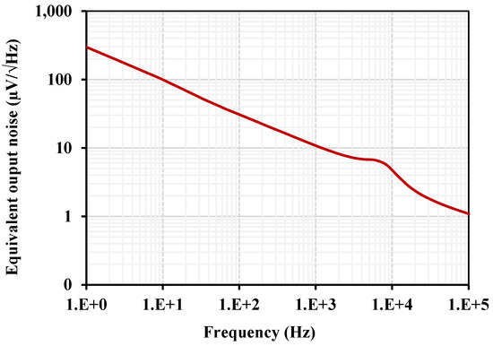 The equivalent output noise is shown in Figure 14. The integrated noise in the filter bandwidth of 4.8 kHz to 12.5 kHz was 485.7 μV; hence, the dynamic range DR was calculated to be 40 dB for 1% IMD3.