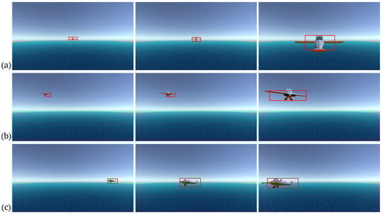 Airprox scenarios. The red frames indicate the detected obstacle. (a) Head-on; (b) close-in; (c) crossing.