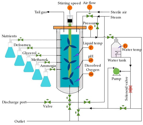 Step 1. In adherence to the fermentation process specifications for Pichia pastoris, the fermentation system underwent sterilization and inoculation steps. The culture medium was sterilized at 130 °C for 30 min, followed by inoculation of strains at 30 °C using a flame. Initial fermentation conditions were set as follows: tank pressure maintained between 0.02 and 0.05 MPa, pH at 5.0, temperature at 28 °C, stirring speed ranging from 300 to 400 rpm, and airflow rate regulated between 150 and 300 L/min.