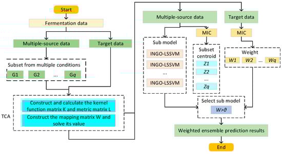 Based on the above analysis, this paper proposes a soft sensor modeling method based on TCA and the MIC-weighted ensemble method to predict the cell concentration and product concentration in the fermentation process of Pichia pastoris under the target working condition. First, considering the inconsistency in the distribution of data between source and target working conditions of the fermentation process of Pichia pastoris, TCA is employed to reduce the difference in the distribution of data between the source and target fermentation processes, and the LSSVM optimized with the INGO algorithm is utilized as the regression modeling algorithm. Secondly, labeled data originate from multiple working conditions; thus, knowledge transfer solely from a single-source condition cannot achieve the desired predictive performance. As a result, this paper establishes sub-models on multiple-source condition datasets and proposes a novel weighting allocation method based on the MIC to assign appropriate weights to each sub-model, facilitating a weighted ensemble. The proposed method is applied to predict the cell concentration and product concentration under the target working condition, and the simulation results demonstrate that the INGO algorithm, compared to the NGO algorithm, is capable of seeking superior parameters for the LSSVM, thereby effectively enhancing the prediction accuracy. Furthermore, the transfer soft sensor modeling method based on the MIC-weighted ensemble proves suitable for the fermentation process of Pichia pastoris under various working conditions. Compared to existing soft sensor models, the proposed method exhibits superior generalization ability and predictive performance, enabling precise real-time monitoring of cell concentration and product concentration under different working conditions.