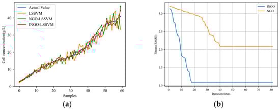 Prediction results of cell concentration under the same working condition: (a) prediction results; (b) the fitness curve of the INGO and NGO algorithm.