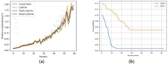 Prediction results of product concentration under the same working condition: (a) prediction results; (b) the fitness curve of the INGO and NGO algorithm.
