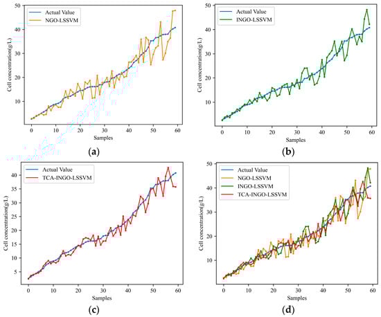 Prediction results of cell concentration with changing working conditions: (a) NGO-LSSVM; (b) INGO-LSSVM; (c) TCA-INGO-LSSVM; and (d) combination of the three models.