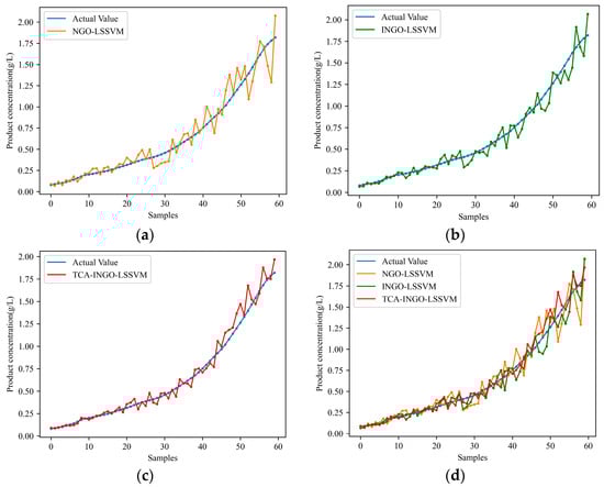 Prediction results of product concentration with changing working conditions: (a) NGO-LSSVM; (b) INGO-LSSVM; (c) TCA-INGO-LSSVM; and(d) combination of the three models.