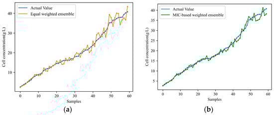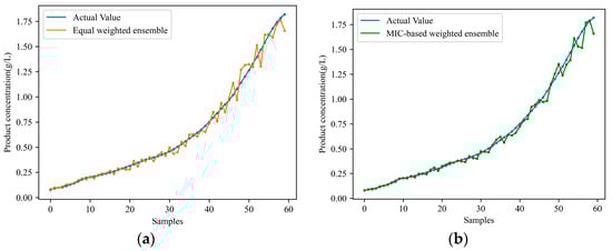 Ensemble multiple sub-models for predicting product concentration in the target condition: (a) equally weighted ensemble; (b) MIC-based weighted ensemble.