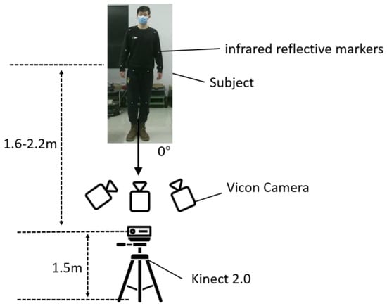 The experimental environment is Intel(R) Core(TM) i9-12900H @ 2.50 GHz CPU, NVIDIA Geforce RTX 3060 GPU (Lenovo Group, Beijing, China), and 16 GB running memory. The operating system is Windows 10, Vicon Motion Capture System, Infrared Reflective Marker Sphere (Vicon Motion Systems Ltd., Oxford, UK), and Kinect 2.0 camera (Microsoft Corporation, Redmond, WA, USA). The Kinect 2.0 camera is about 1.5 m from the ground and 1.6–2.2 m from the tester. It is placed horizontally towards the tester.