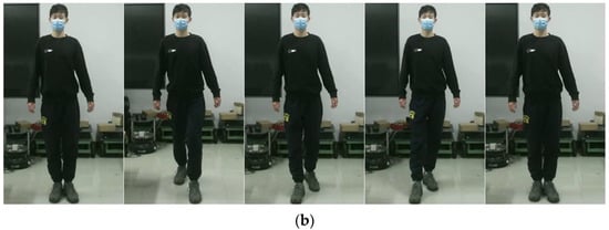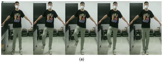 During the gait balance function rehabilitation training, the participant initially assumes a standing posture. They must maintain a stable upper body and then elevate the upper limbs sideways from the body. The lower limbs are gently raised and lowered, lifting the legs as high as possible and walking in a straight line to one side. This action is illustrated in Figure 3a. For weight transfer rehabilitation training, the participant first stands in position. They then support one leg and maintain its position while the other leg takes a small step forward, transferring the body’s weight to this leg. Next, they perform a lunge with bent knees, shifting their weight onto the supporting leg. Subsequently, they retract the other leg and take a small step back, transferring the body’s center of gravity from the supporting leg to this leg. This cycle is repeated three times, as demonstrated in Figure 3b.